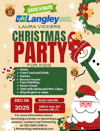 Following the parade families will gather in Downtown Bushnell at the Marge A. Thies Plaza Park for photos with the Grinch as well as Santa and Mrs. Claus.