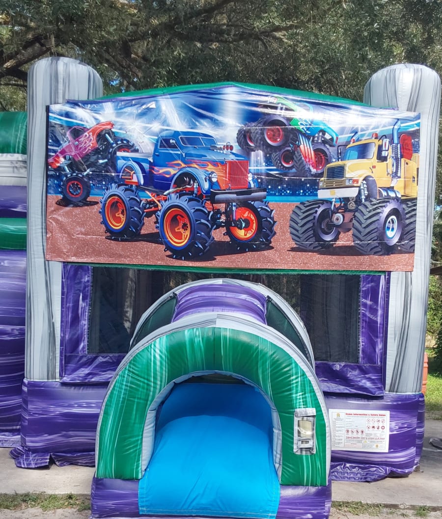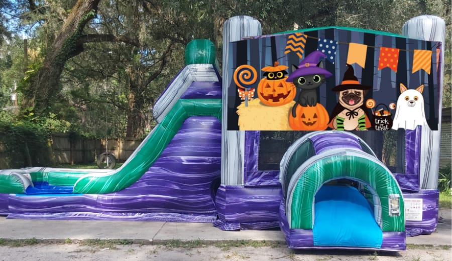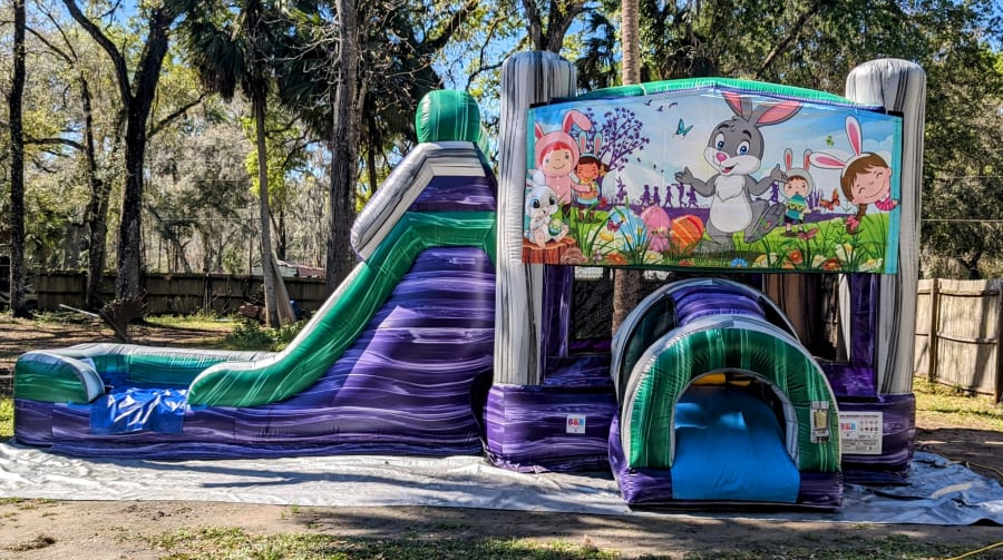 Looking for the ultimate inflatable fun for your next event in Sumter County, Florida and surrounding areas? Look no further than the Purple/Green Combo - our wide single lane wet/dry bounce house combo that guarantees hours of excitement and laughter!