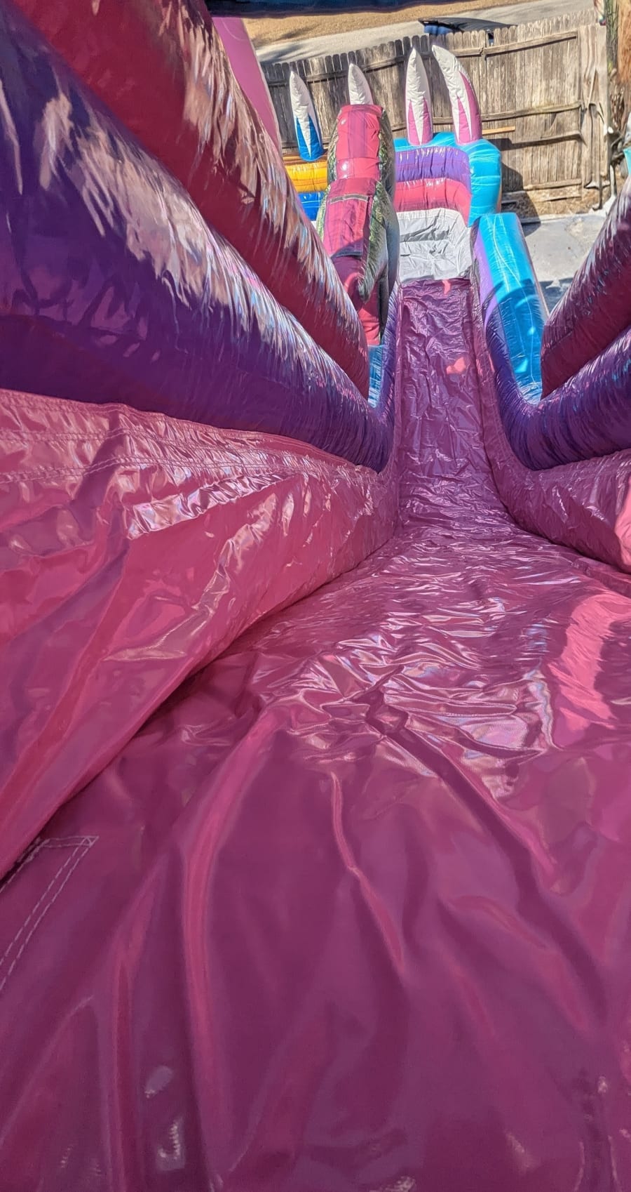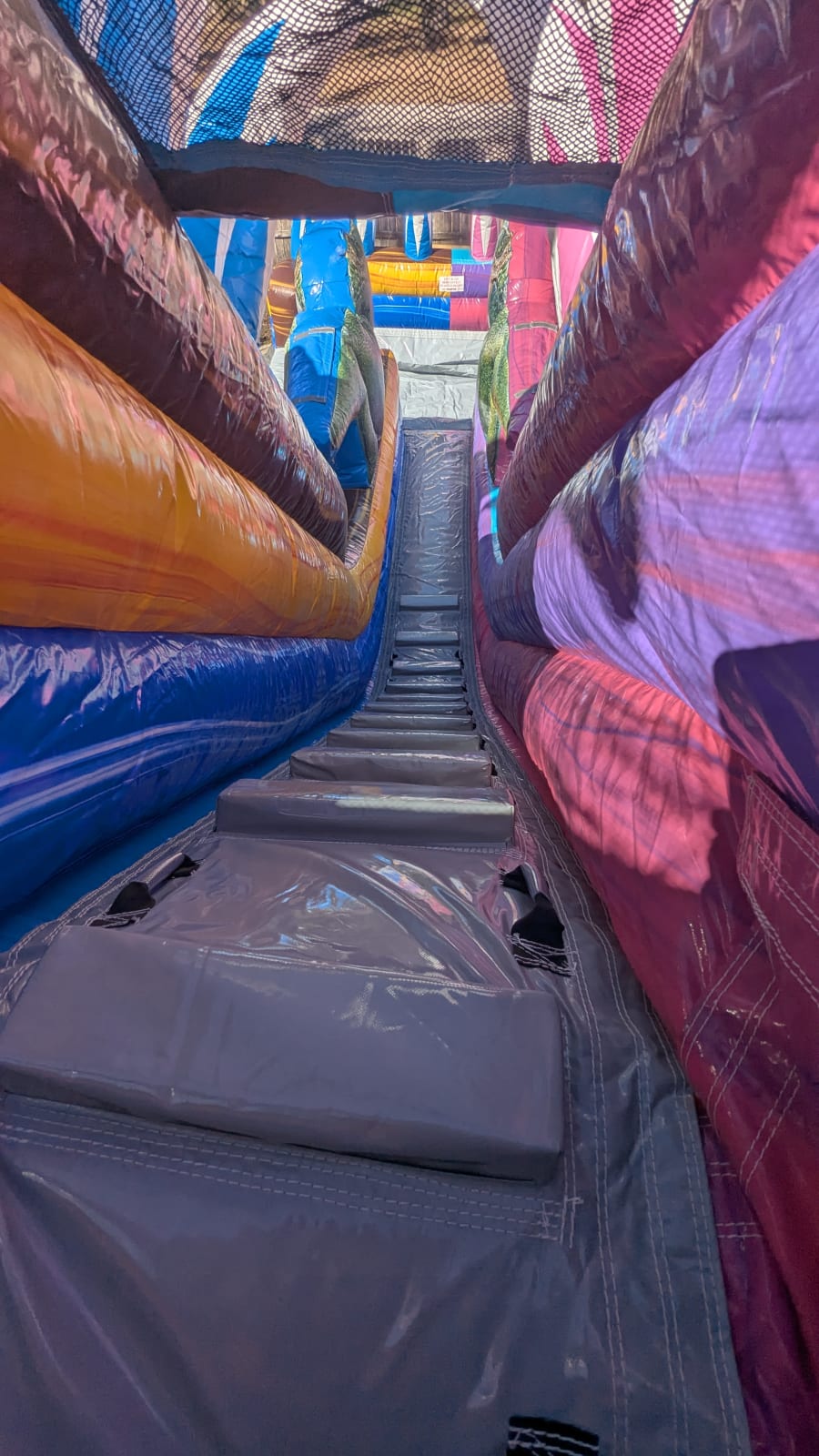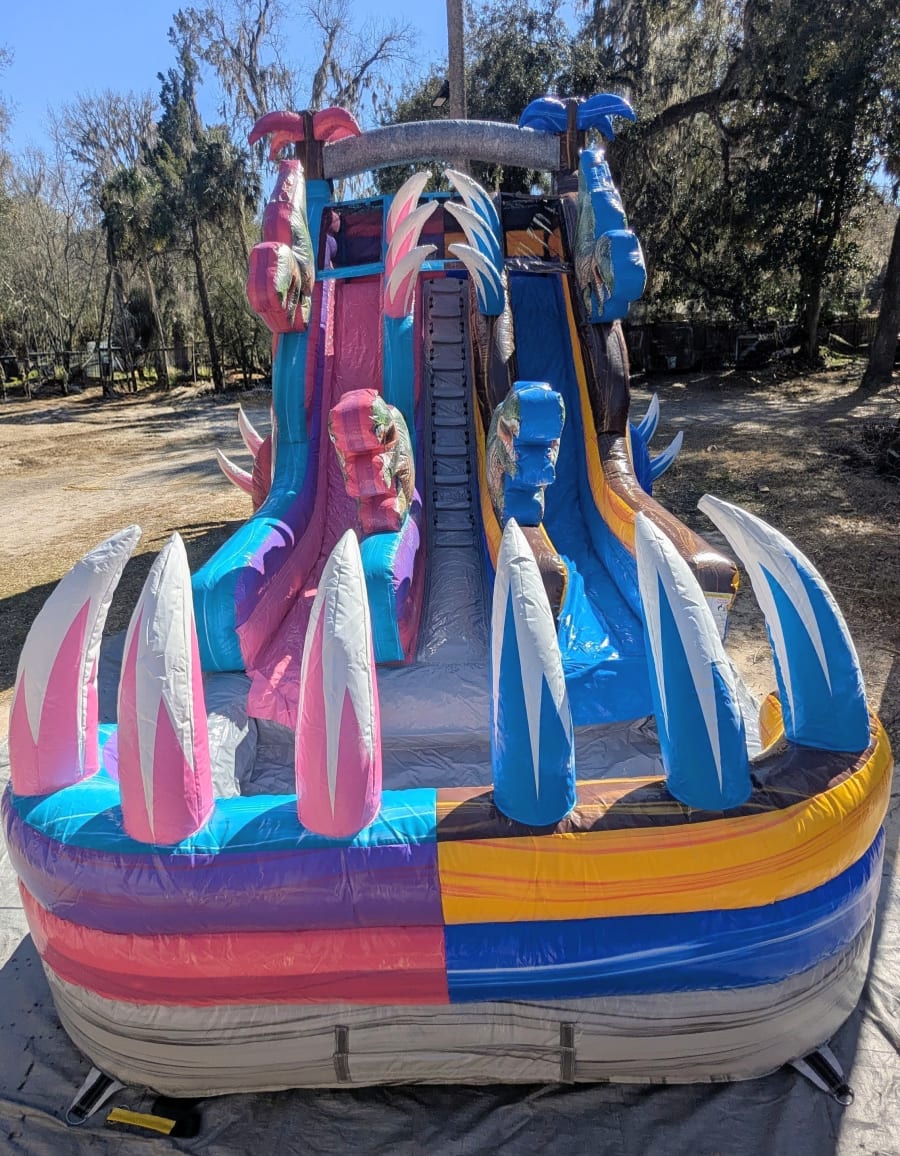 Bring summer fun to your next party with the Dino Duel dual lane water slide. This eye-catching blue and pink dinosaur slide features a center climb and an extra-large splash pool. Perfect for races, team play, and cool-downs. Book the Dino Duel and create lasting memories. 🦖💦🎉